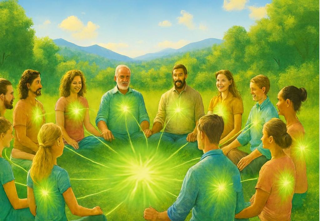 4. Mientras se conectan con la resonancia de su corazón, todas las personas deben mover su conciencia hacia un lugar central dentro del círculo. Permitan que se despliegue el entramado energético de la resonancia colectiva de los corazones.